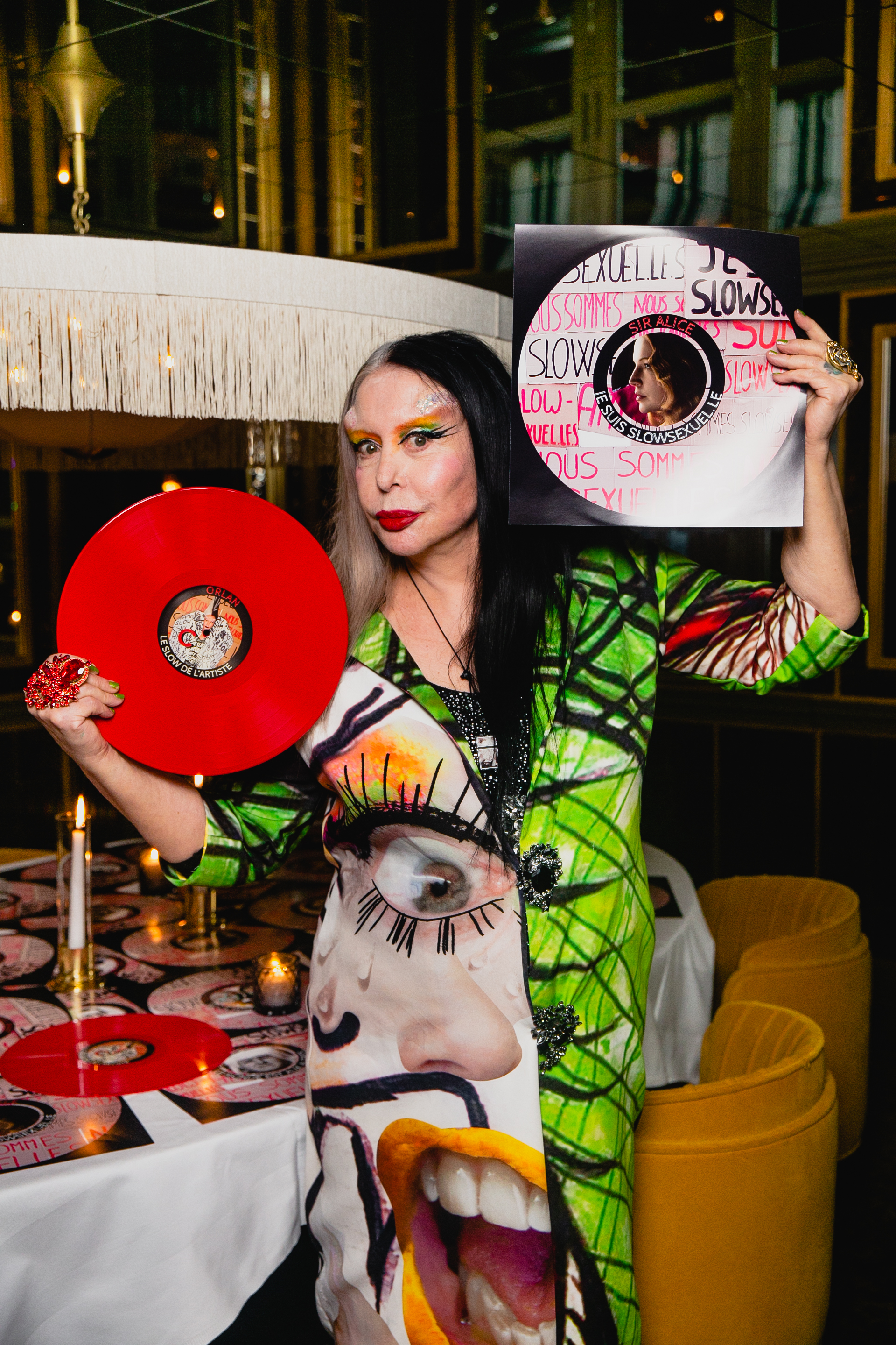 Ainsi, chaque robe était recomposée avec une moitié de la robe d’Agatha Ruiz de la Prada, et une moitié des robes de la garde robe d’ORLAN dont je ne connais pas forcément le styliste. ORLAN a gardé depuis l’adolescence toute sa garde-robe.