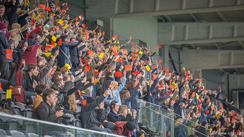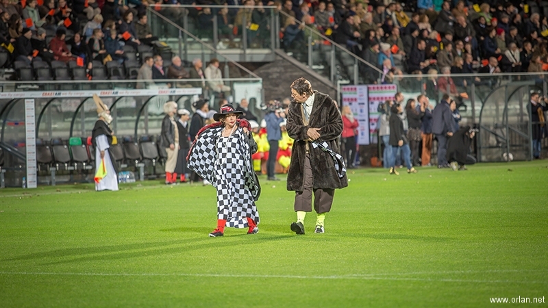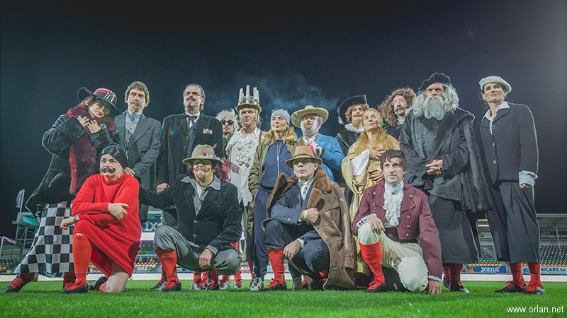Match Selavy est une grande performance publique organisée par Yann Fabre à Anvers dans un stade de football. Chacun.ne de ses invité.e.s devait s’habiller en évoquant un personnage de l’histoire de l’art. ORLAN s’est costumée en Rose Selavy. Lorsqu’elle est arrivée dans le stade, ORLAN a eu la grande surprise de retrouver le directeur de musée Bart de Baere avec une tonsure en étoile. Ils se sont de suite mis en “couple” et pendant que tous les autres essayaient de taper dans le ballon, ORLAN et Bart de Baere étaient allongés sur le gazon en jouant aux échecs sur la doublure en damier du manteau d’ORLAN. Ils ont aussi marché mollement d’un but à l’autre, séparément ou bras dessus bras dessous. |