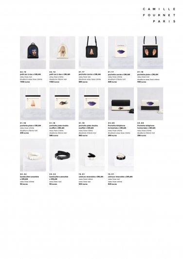Un œil, une bouche, un nez : « le corps est un sac, le corps est un costume ». Par cette nouvelle création, ORLAN s’inscrit dans le cuir, dans la chair de la maison Camille Fournet. Cette rencontre permet à l’artiste de casser les murs de glace entre les pratiques en créant des porosités entre les arts visuels, le luxe et la maroquinerie. Show More |
