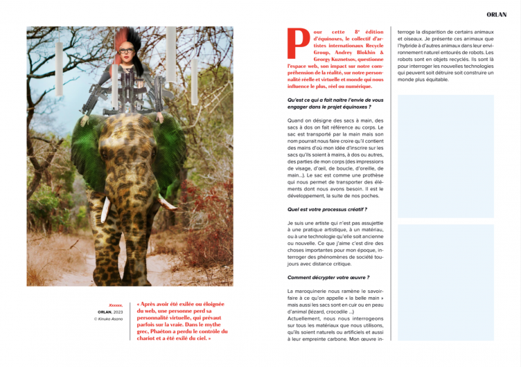 Cette œuvre a été réalisée par ORLAN en 2023 dans le cadre d’Équinoxes 9. Équinoxes c’est la rencontre vibrante entre la maison Camille Fournet et un.e artiste : un échange d’univers, un espace de liberté artistique sans aucune retenue, inspiré par les codes de la Maison. Show More