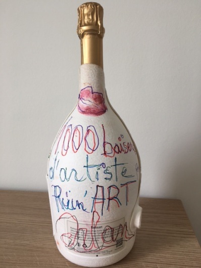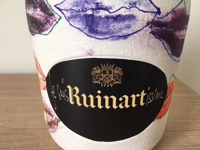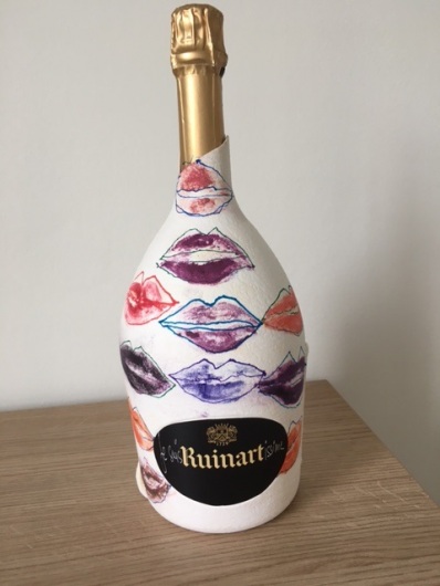 La Maison Ruinart invite ORLAN à travailler autour du packaging de leur fameuse bouteille de Champagne. ORLAN investit l’espace avec des baisers multicolores afin d’offrir “mille baisers d’artiste”. Une bouteille unique et légendaire.