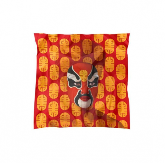 ORLAN x Brochier Soieries, Carrée de soie, Self-hybridations Masques de l’Opéra de Pékin, Facing Designs et réalité augmentée n°1, 2016, 90×90 cm